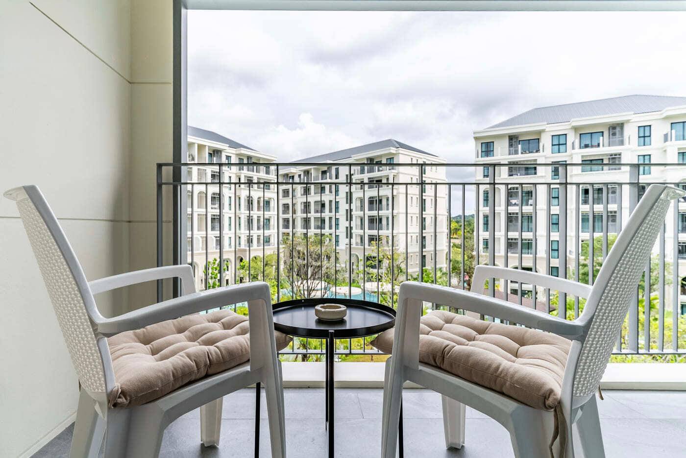 Комфортный балкон, превышающий стандартный размер для квартир такого формата. Оборудован стиральной машиной 9 кг с горячей стиркой, сушилкой для белья и балконной мебелью.