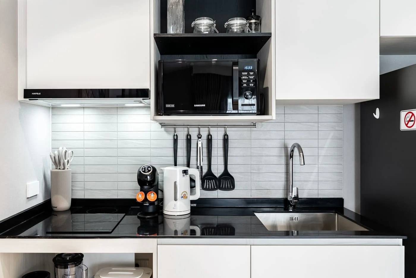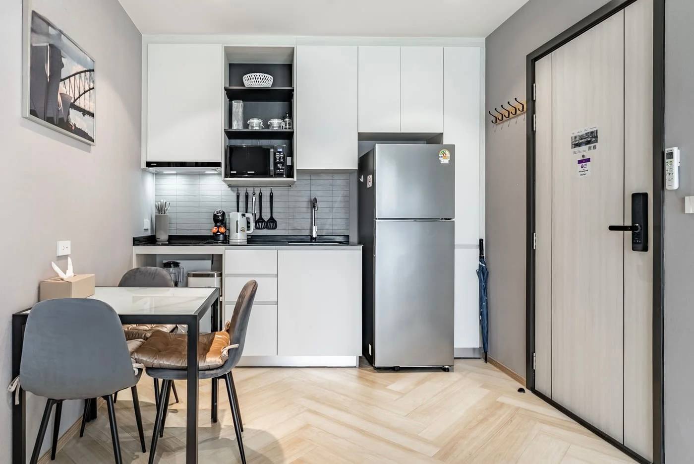 Полностью оборудована для жизни: холодильник, микроволновая печь, кофемашина, тостер, блендер, полный набор посуды и кухонной утвари на 4 человека, обеденный стол.