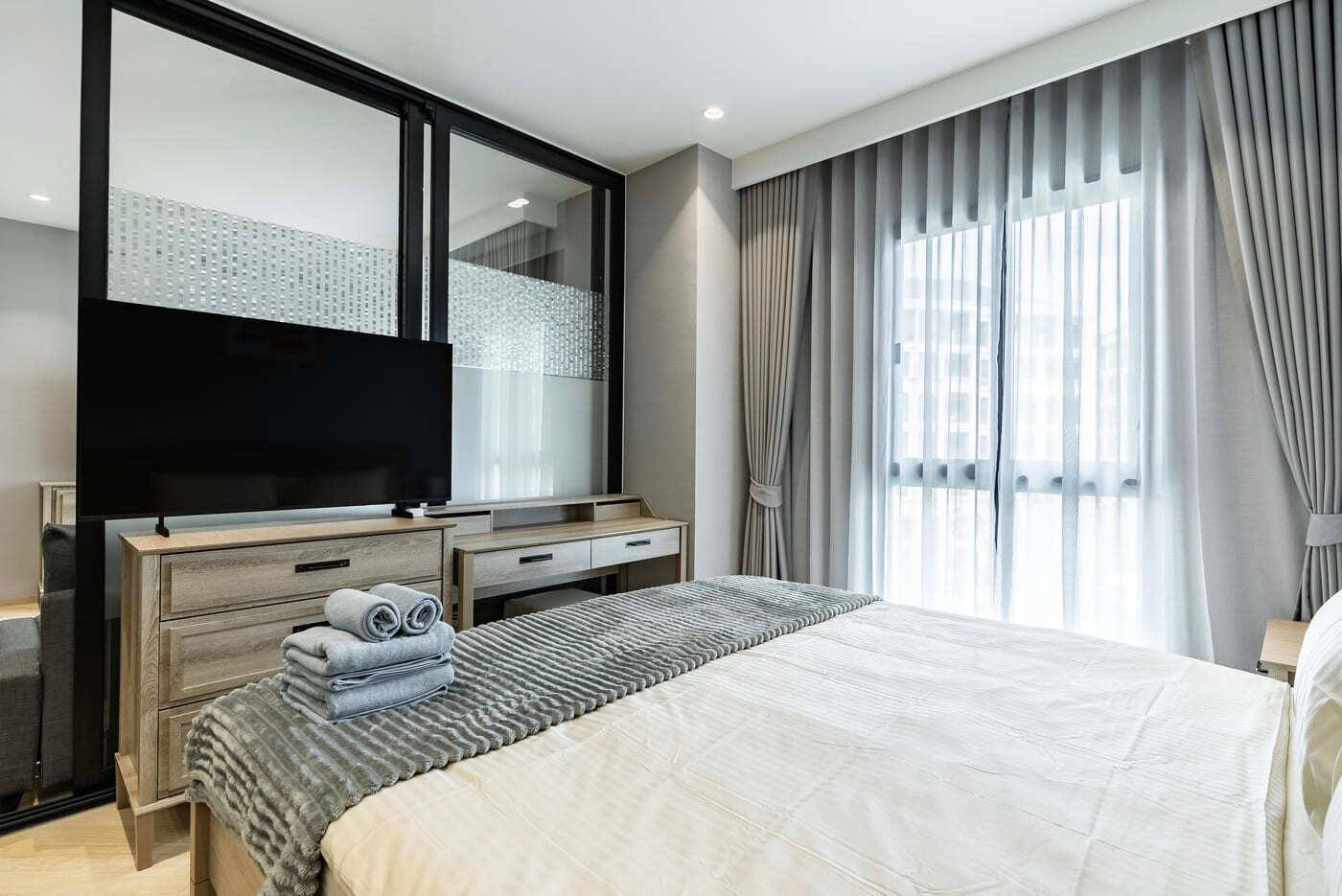 Спальня легко отделяется от общей зоны слайдерной системой.