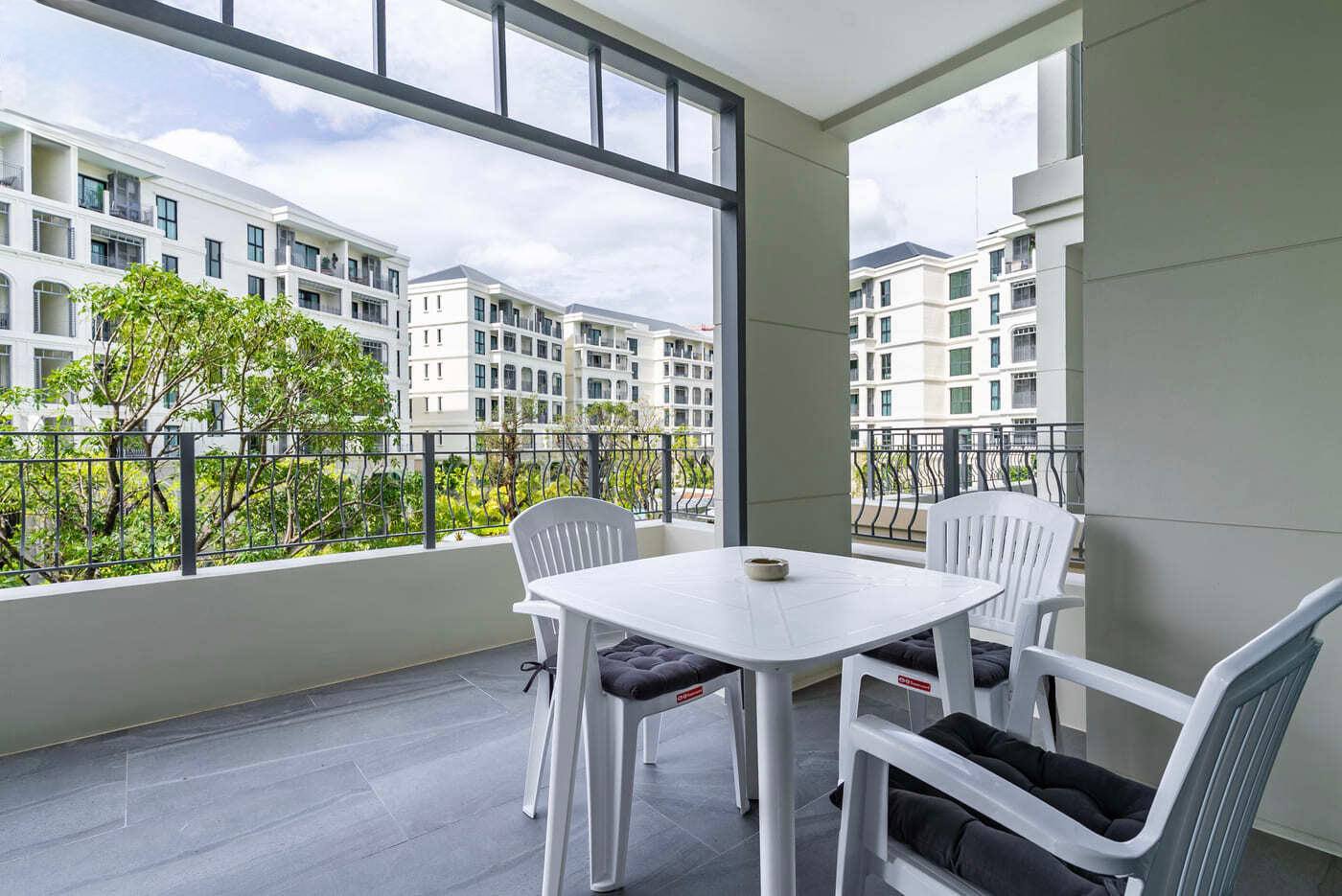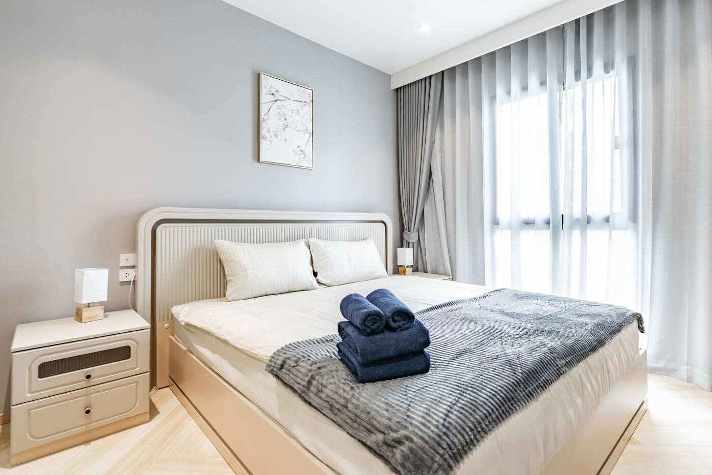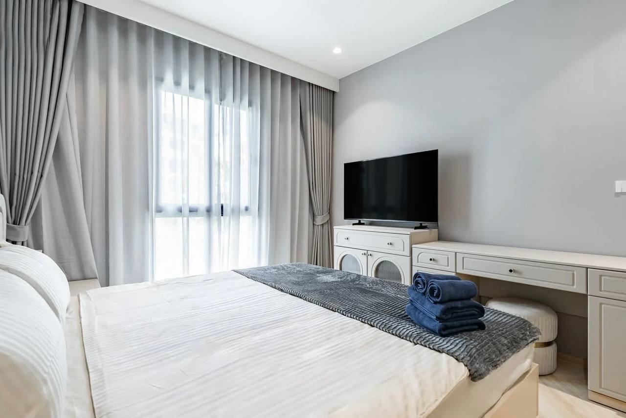 Отдельная спальня с двуспальной кроватью 1,8 × 2 м, Smart TV 40”, системой хранения, прикроватными тумбами и кондиционером.